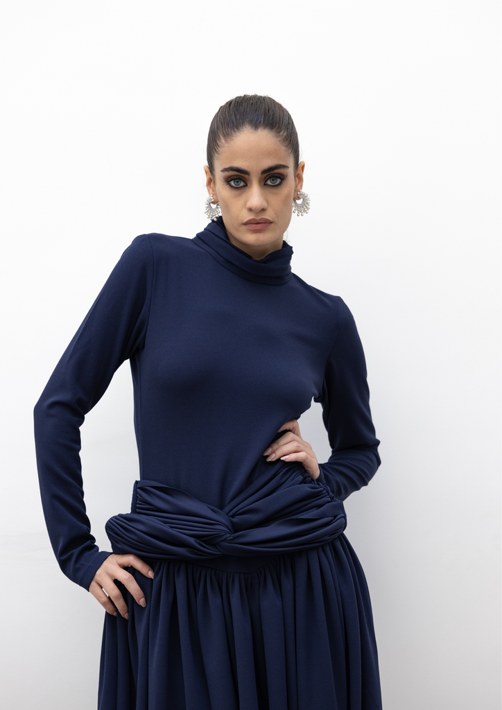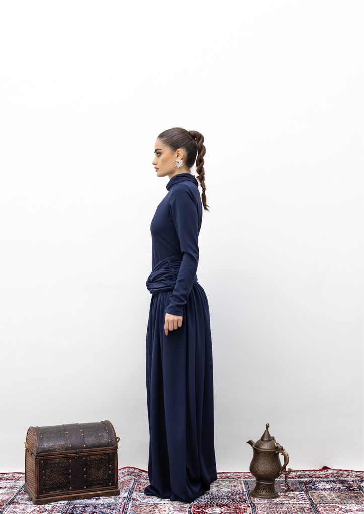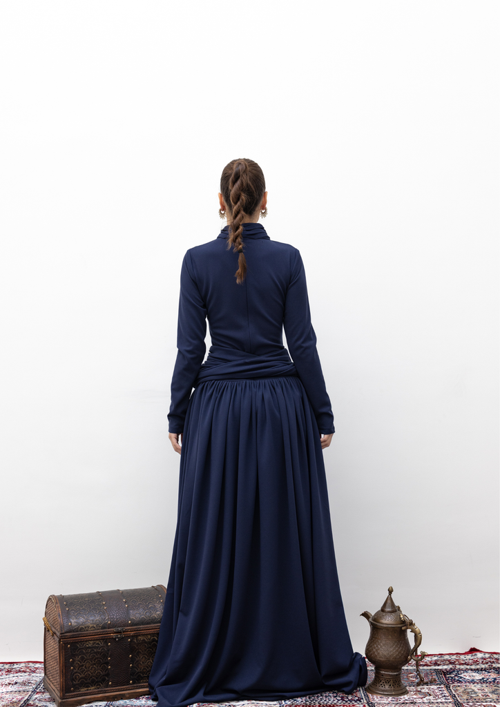 Blue high neck kaftan with belt