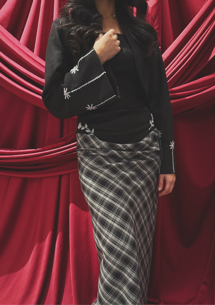 Two-tone kaftan designed with a fitted inner silhouette and a cropped jacket overlay.