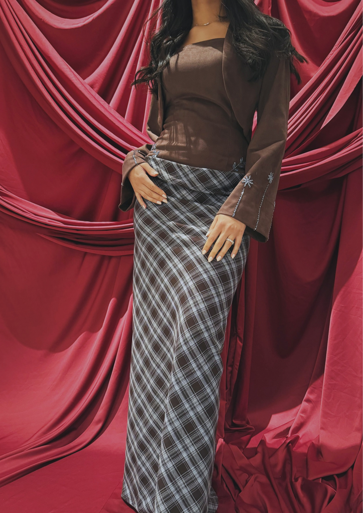Finished with embroidered detailing and a grid-patterned skirt.